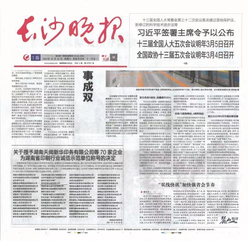 长沙日报报道株洲学园印刷为湖南印刷行业2020一2021诚信示范单位